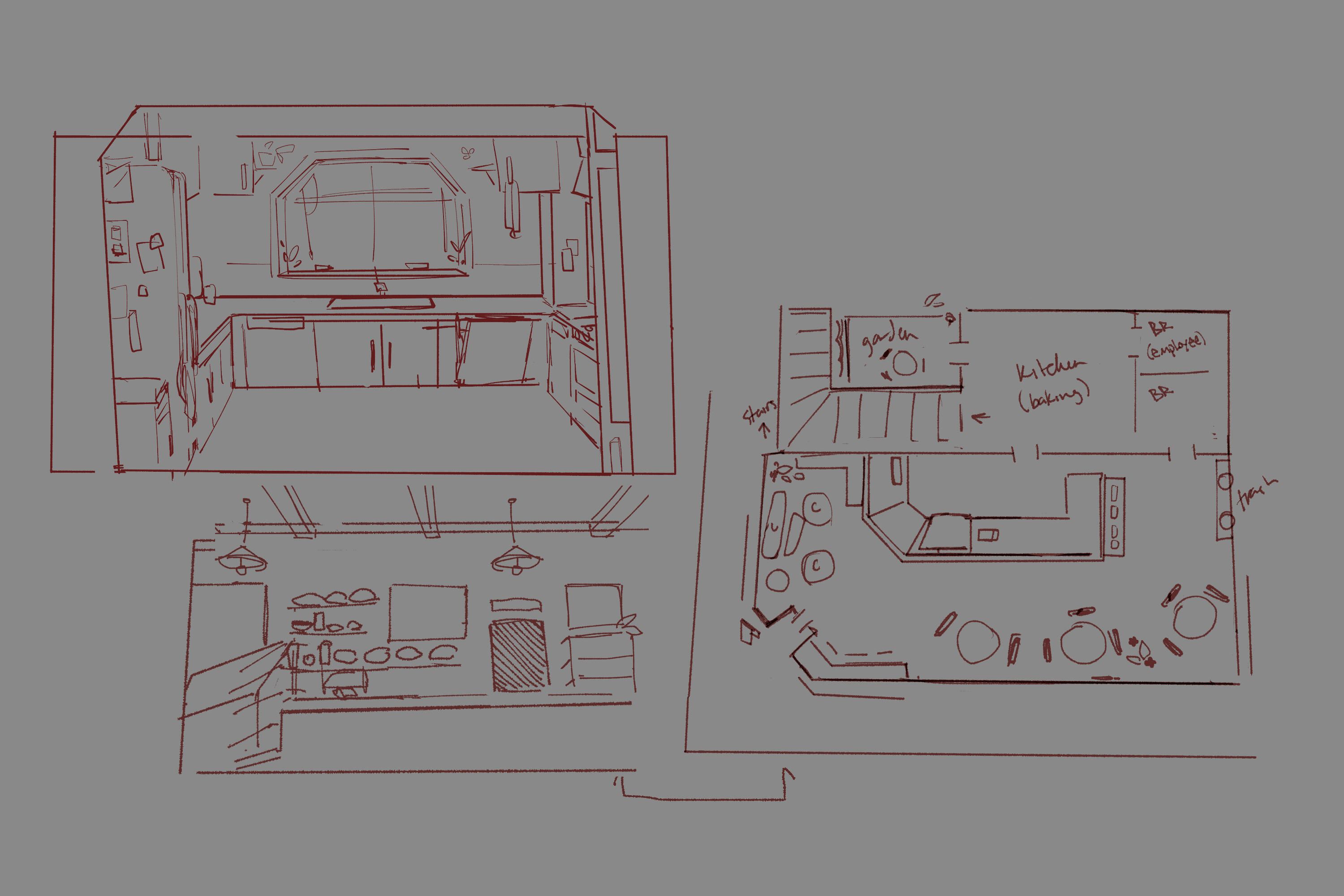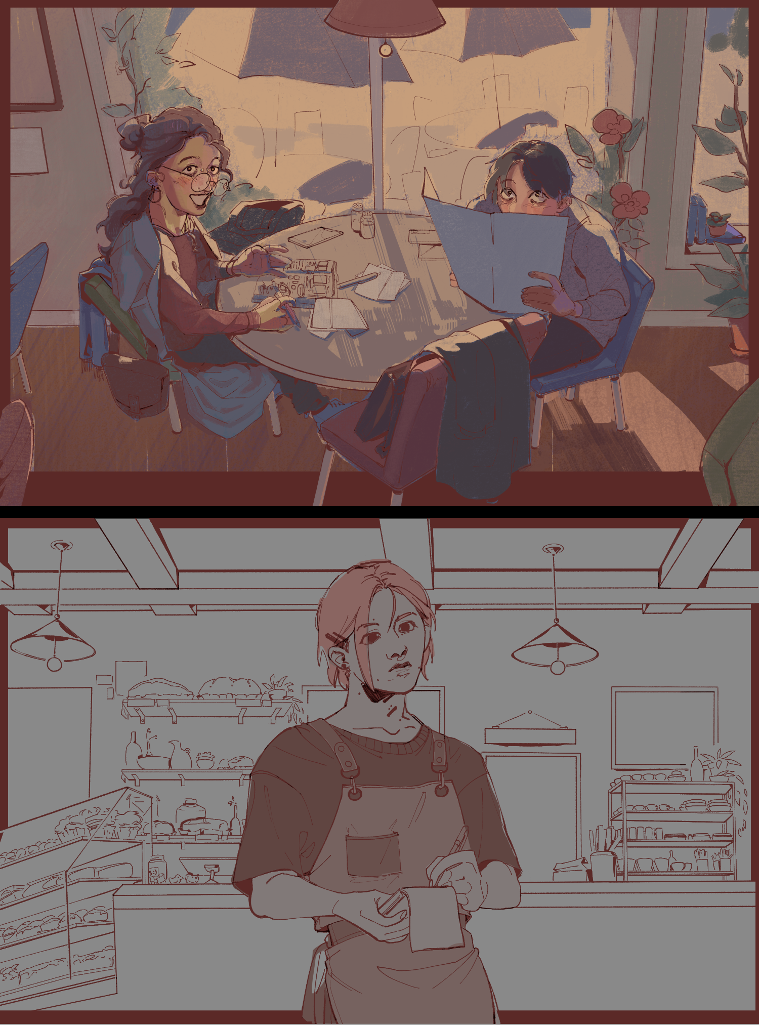 Bicker takes up the majority of the pause screen. It's what the player loads in to by default upon hitting tab, and as the live game stands, it's... kind of underwhelming!, both compositionally and in terms of information provided to the player. Bicker is fun, sure, but it's not gameplay-relevant enough to warrant its own dedicated screen with no other real usage of the space around it, especially when other features— like the questlog and player decision records (mostly depicted in-game as text messages)— are either hidden (such as the questlog behind layers of map interaction) or don't make a player-accessible appearance at all.The objective here is mainly to fulfill these three goals:1. To restructure the pause screen to make better use of space, both compositionally and in terms of usefulness,2. to give the player a visual reference for core gameplay-related information (including, but not limited to, both a more immediately locatable objective list and some way to track dialogue option deviations based on whichever behavior-modifying drinks they have Milo and Lola down), and3. to give Afterparty's UI a bit more of that distinct, engaging character that exists within the visuals and atmosphere established in-game.