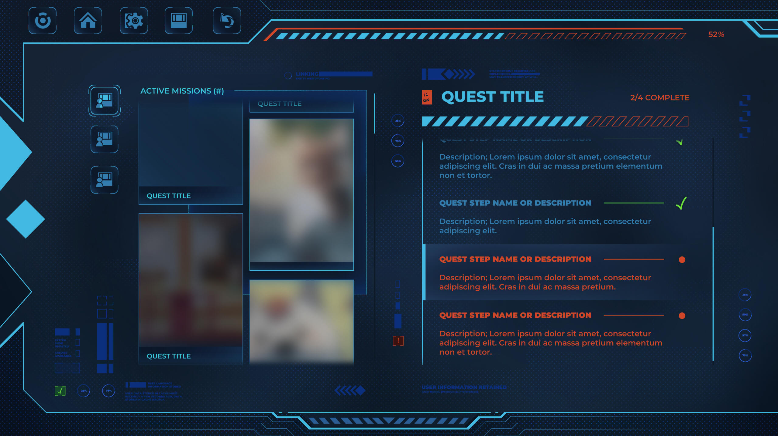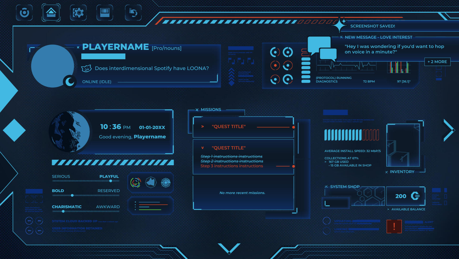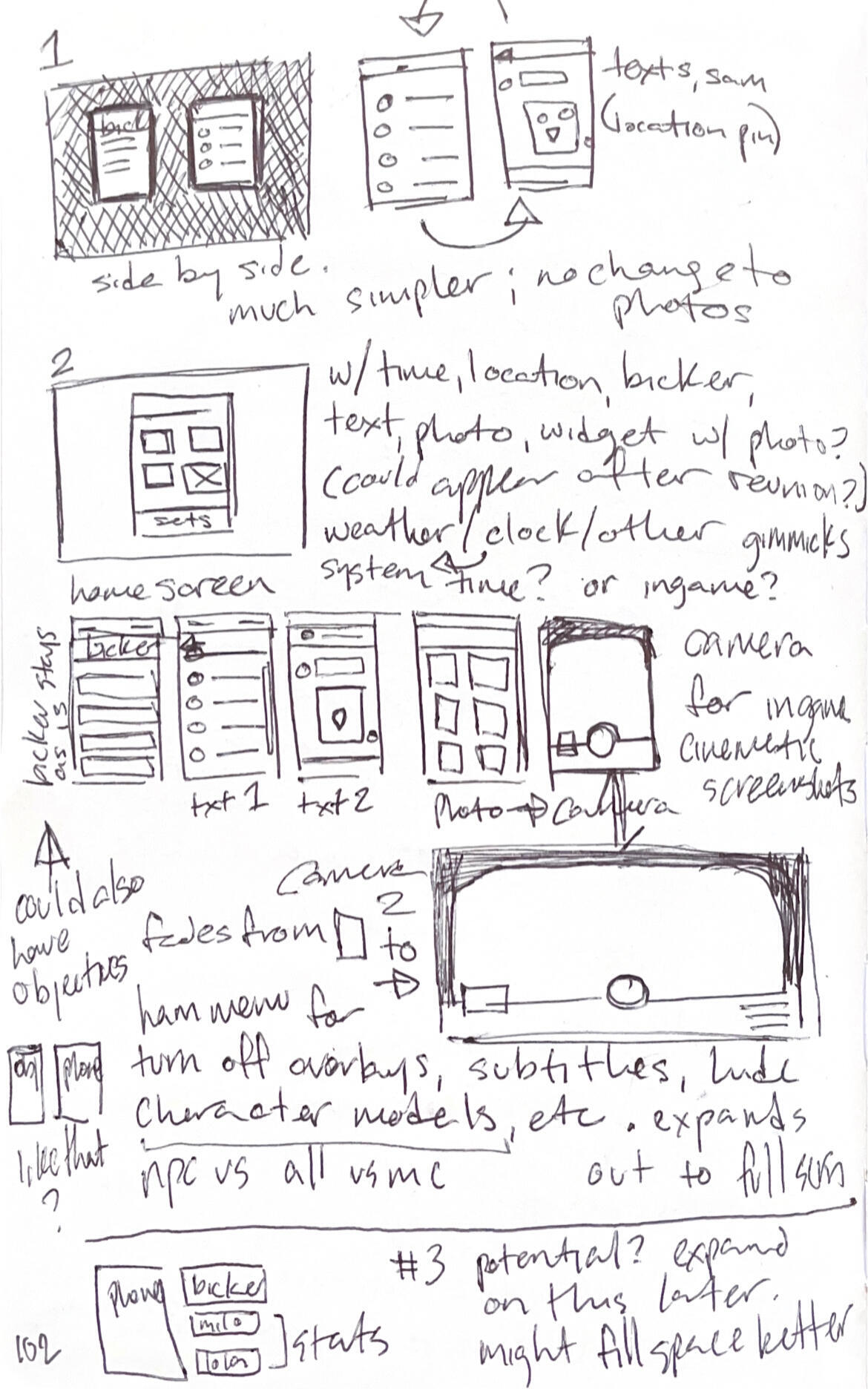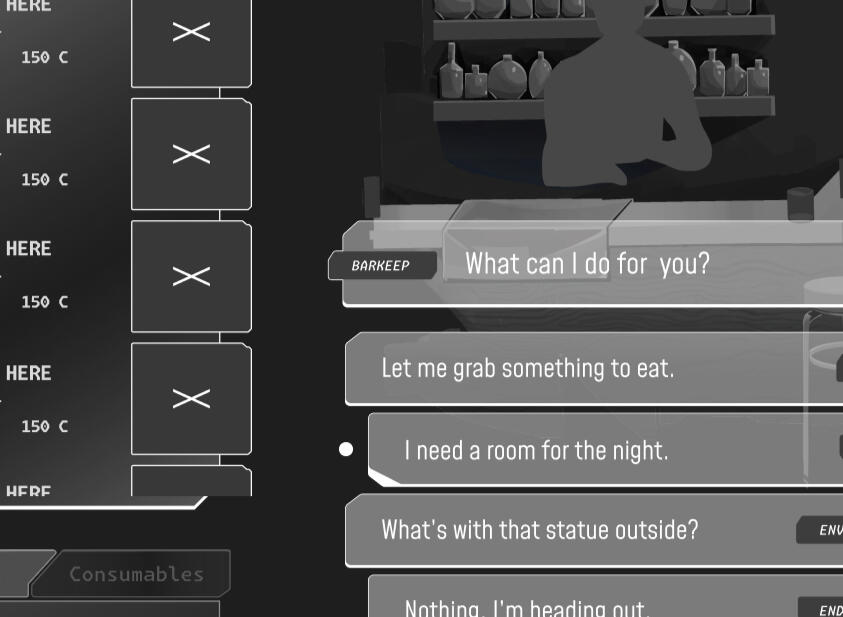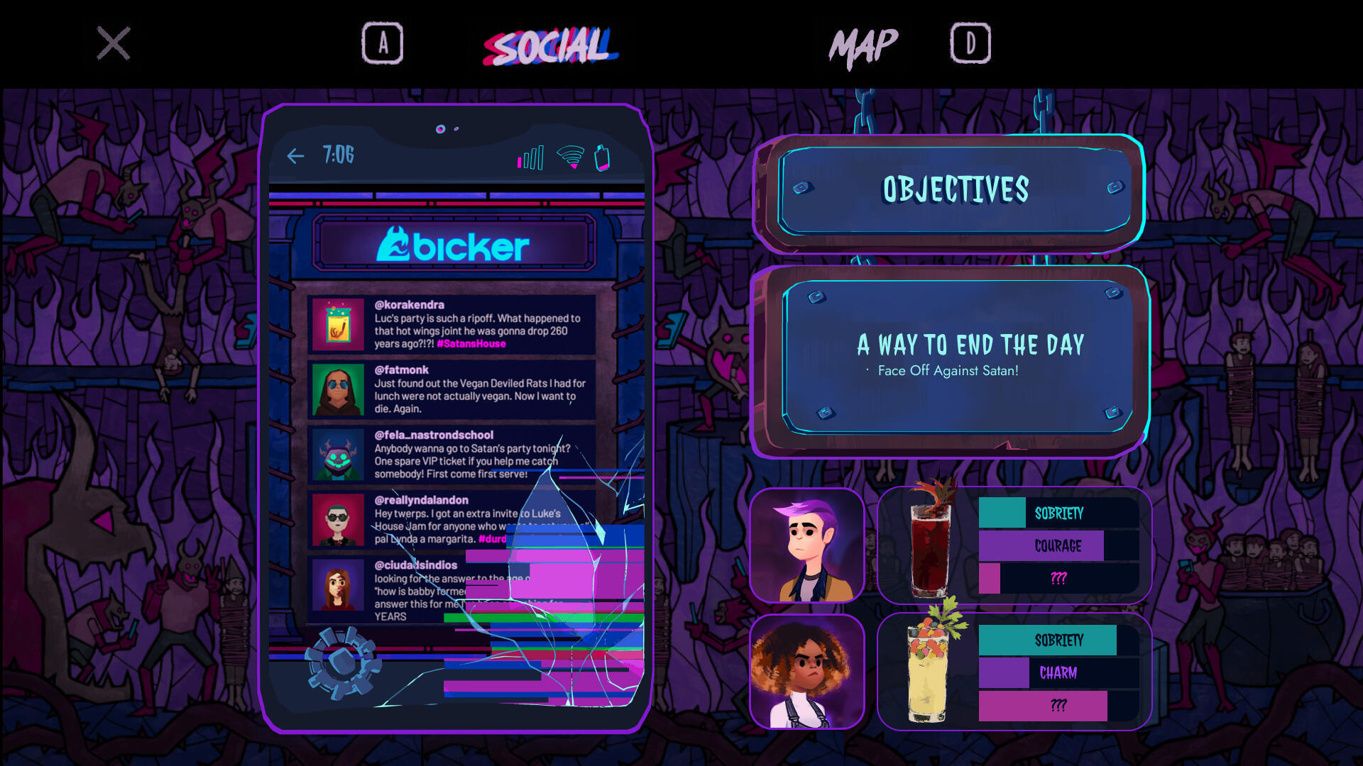 The composition went through quite a few (extremely) low-fidelity iterations before I landed on what's embedded above. Included are the objective list, a kind of status-bar format to reference which drinks the player chose, as well as visual cues for both the remaining duration and hints as to how, exactly, Milo and Lola's dialogue options are changed depending on what they've drank. To the left is a phone— stylized with cracks and dead pixels, because let's be real, nobody's getting a decent phone in Hell— from which the player can access Bicker, their past messages, and their camera roll.