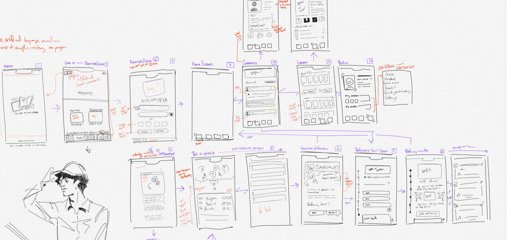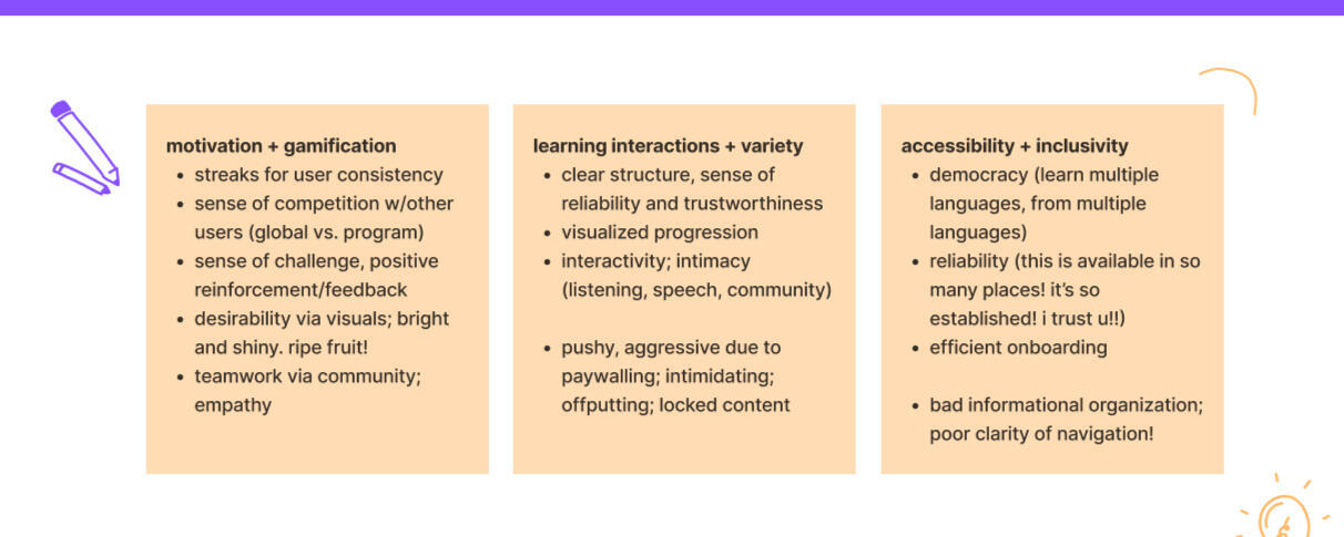 So, how's about moving forward with finding a fix? I think that's a good idea. Let's do that.After all the research you see above... user personas (the three right below)! User flows! Tone of voice! Who's using this, and how should it look and feel to appeal to them, and work for them the best it can? As it turns out, I do have some solutions in mind.Codex is a language-learning product that prioritizes a naturalistic learning style for users hoping to learn or bolster proficiency in a second language, which will allow them to gain confidence and fluency by:> regular grammar and vocabulary lessons, including notes describing slang and nuance;